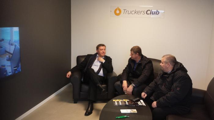 Geir A. Mo (t.v.), Jacob Schram og Bård Hoksrud tar en prat inne i Truckers Lounge, som er et avgrenset hvileområde inne på stasjonen kun for yrkessjåfører.