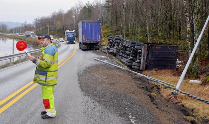 I GRØFTA: Tilhengeren kom for langt ut på kanten og det svenskregistrerte vogntoget havnet i grøfta på E39, like vest for Flekkefjord.