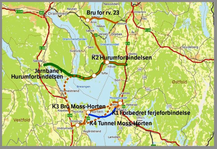 I finalerunden har følgende konsepter blitt analysert: forbedret ferjetilbud, veg og jernbane via Hurumlandet og bru og tunnel mellom Moss og Horten.