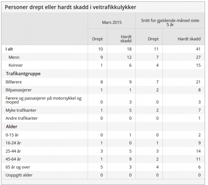 I alt omkom ti personer i trafikken i mars 2015 (foreløpige tall fra politiet). Av disse var ni menn og én kvinne. Åtte var førere av bilene, mens én var passasjer. Én fotgjenger ble også drept i mars. Generelt er det en økning av eldre bilister på veiene. I mars omkom fem personer i alderen 65 år og oppover. Selv om tallene er lave er dette fem ganger flere enn i aldersgruppen 16 – 24 år