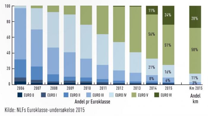 Norske lastebileiere er i verdenstoppen når det kommer til utskifting av eldre kjøretøy. Ved forrige Euroklasseundersøkelse som ble utført blant NLF-medlemmer i november 2015 kom det fram at nærmere 90 prosent av alle kjørte kilometer foretas med Euro V eller Euro VI-lastebiler. Samtidig fases Euro IV og lavere klasser ut i rekordfart. Prognoser som NLF har gjennomført, viser at i 2020 vil så mye som 80 prosent av medlemmenes kjørte kilometer bli foretatt med Euro VI-lastebiler.