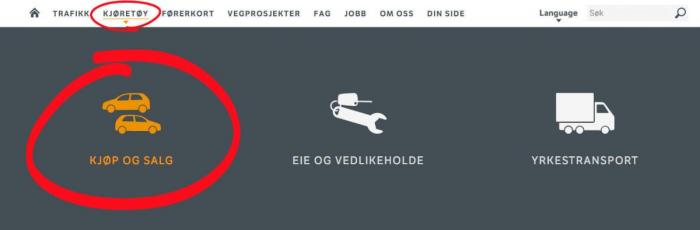 1. Gå inn på Statens vegvesens nettsider, www.vegvesen.no. Velg fanen "kjøretøy" og deretter underkategorien "kjøp og salg". (Alternativt kan adressen www.vegvesen.no/bilinfo brukes for å komme rett inn til riktig side.)
