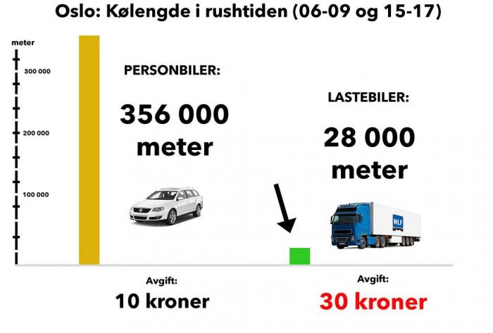 Selv om et vogntog tar mye større plass på vegen enn en personbil, forårsaker sistnevnte kjøretøygruppe mer enn 10 ganger så store køer. Det er ikke rart, siden nærmere 80 000 personbiler kjører inn til hovedstaden i rushtiden hver eneste dag. Samtidig finner du færre enn 1500 lastebiler på innfarts- og utfartsveiene.