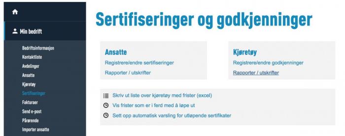 Nå kan du legge inn sertifiseringer og godkjenninger for ansatte og kjøretøy. Husk å fylle inn gyldighetsdato og be om varsling før utløp.