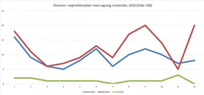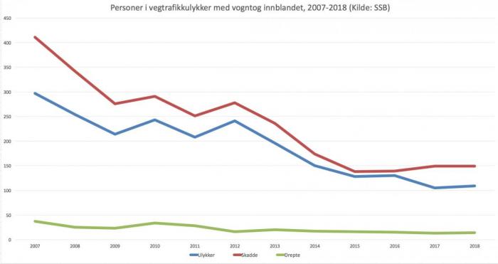 Ut fra de foreløpige tallene som er publisert fra fjoråret, kan det likevel se ut til at antallet drepte og hardt skadde har holdt seg noenlunde stabilt. Mens det i 2017 ble rapportert om 13 dødsfall knyttet til totalt 105 ulykker med vogntog, er tilsvarende tall i 2018 14 dødsfall knyttet til 109 ulykker. Antallet skadde har holdt seg på stedet hvil, med 149 innrapporterte skader både i 2017 og 2018.