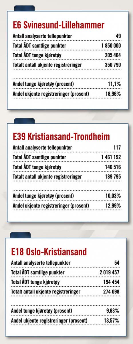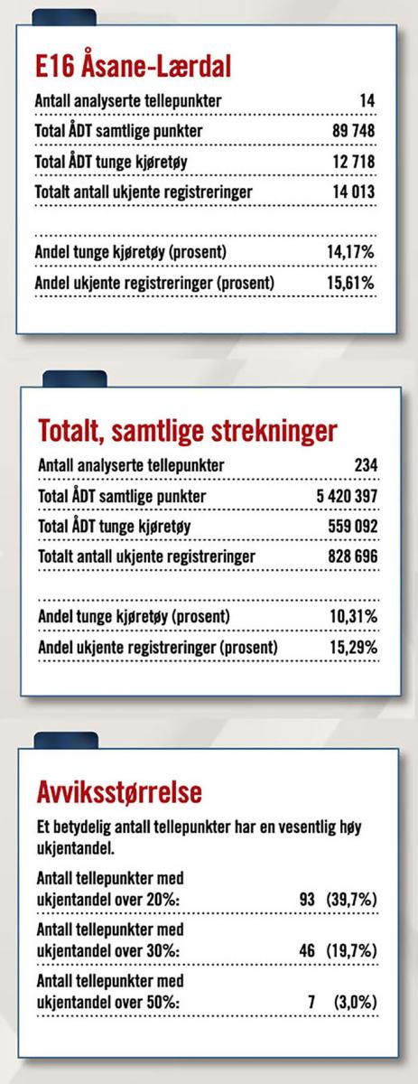 Men i NLFs gjennomgang er det avdekket en langt høyere feilmargin: Det er i gjennomsnitt registrert 3 541 ukjente passeringer per punkt. Det er 1,5 ganger det totale antallet tungbilregistreringer, og fem ganger høyere enn TØIs toleransekrav.