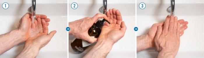 Er hendene skitne, er det kun såpe og vann som gjelder. Den rengjørende effekten ved bruk av såpe skyldes at fettløsende midler i såpen i kombinasjon med vann løser opp løstsittende bakterier sammen med skitt og organisk forurensning.