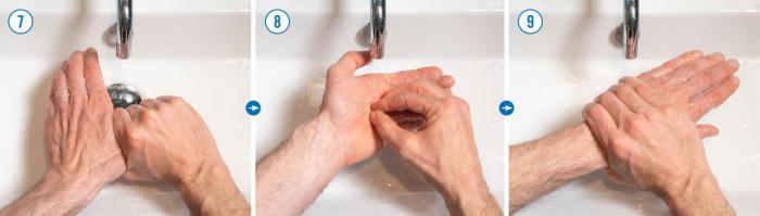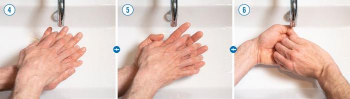 4: Gni høyre håndflate over venstre håndbak inkludert mellom fingrene, og motsatt.