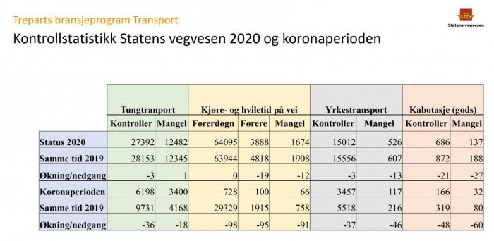 I de vedlagte tabellene (se under) er antall kontroller oppgitt, fordelt på tidsrom og type kontroll. Periodene er både før og under koronaperioden, for at tallene lett skal kunne sammenlignes.