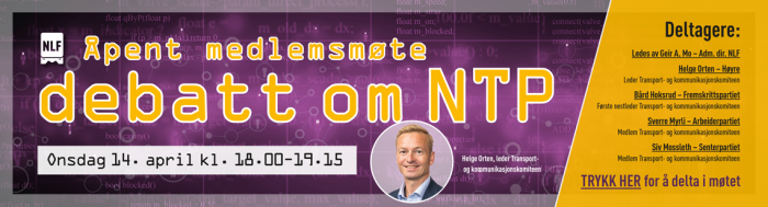 Vi håper dere gleder dere like mye som oss til dagens digitale medlemsmøte om NTP! NLFs Geir A. Mo skal fyre opp Stortingets transport- og kommunikasjonskomité til debatt, og med i studio er Helge Orten, Siv Mossleth Bård Hoksrud og Sverre Myrli.