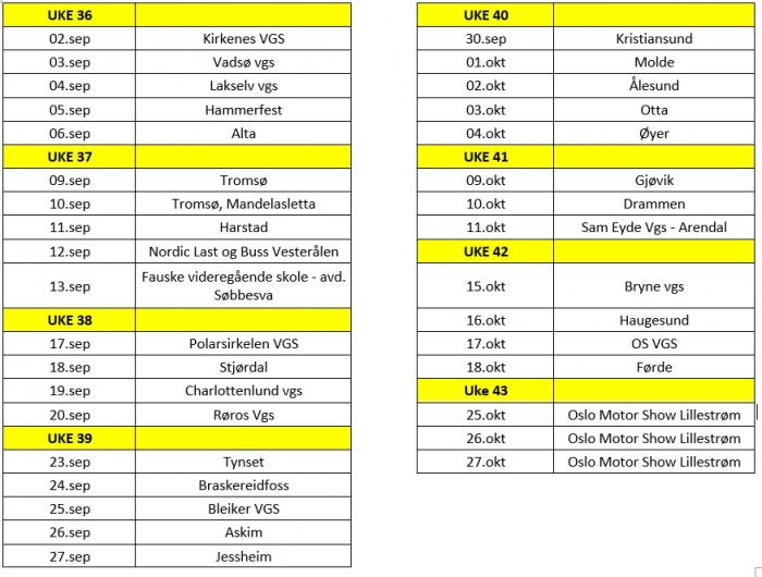 På de lokale arrangementene vil det være representanter fra bransjen, videregående skoler, opplæringskontorer og lærebedrifter. Det er anslått at mellom 7000-8000 ungdommer vil få muligheten til å treffe transportnæringen i løpet av hektiske uker fra nord til sør. Vi ønsker å rette oppmerksomheten rundt rekruttering av yrkessjåfører, spesielt blant ungdommer.