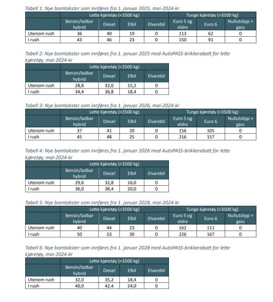 Tabellen viser nye takster som innføres 1. januar 2025, 1. januar 2026 og 1. januar 2028. De nye bompengetakstene skal prisjusteres til aktuell kroneverdi før de innføres, med utgangspunkt i konsumprisindeks fra mai 2024.