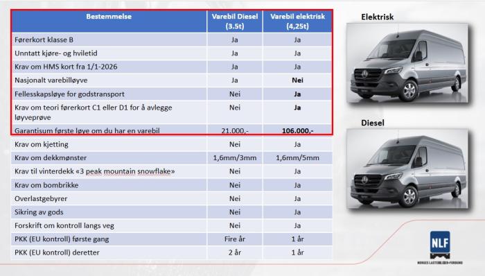 - Elektriske varebiler kan veie opptil 4,25 tonn på grunn av tyngre drivlinje, men behandles likevel som lastebil etter regelverket.