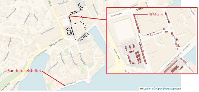 Du finner NLFs stand øverst i Peder Thomassons gate, midt i Arendal sentrum (se kart). Vi håper du tar turen innom i løpet av uken – for en prat, en opplevelse og kanskje noen nye perspektiver på hva som skal til for å løfte norsk tungtransport inn i fremtiden.