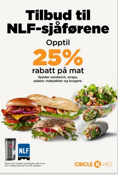 Nå får alle NLF-sjåfører opp til 25 prosent rabatt på utvalgte matvarer hos Circle K. Skann NLF-oblaten på Koppen, eller bruk NLF-medlemskortet for å få rabatten.