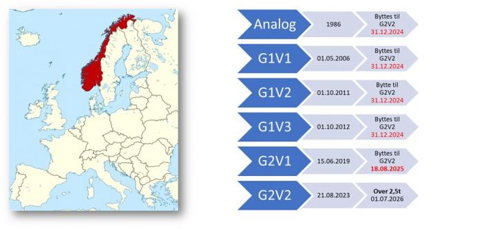 31. desember 2024: Siste frist for å bytte fra enten analog, eller digital (G1V1, G1V2, G1V3 som er i kjøretøy registrert FØR den 19/6-2019 ) over til G2V2.