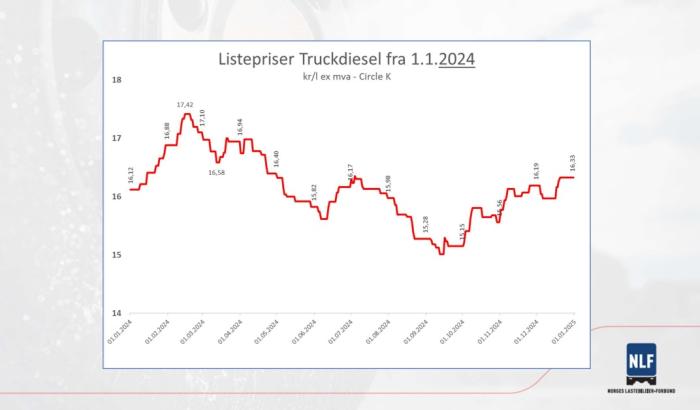 Grafen viser Circle Ks brutto listepriser for truckdiesel ex mva.
