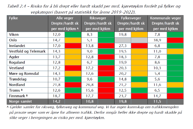 Risikoen for å bli drept eller hardt skadd er klart størst på Innlandets fylkesveger – målt per milliard kjøretøykilometer. Innlandets tall er 27,3. Lavest er Troms med 12,5.