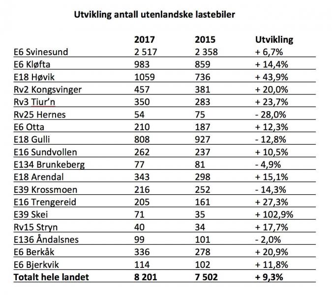 Fra 2015 til 2017 har antallet utenlandske lastebiler ved samtlige tellepunkter økt fra 7 502 til 8 201 - en økning på 9,3 prosent. Det er høyere enn SSBs registrerte tall for grensekryssende gods, som i samme tidsrom bare økte med 6 prosent.