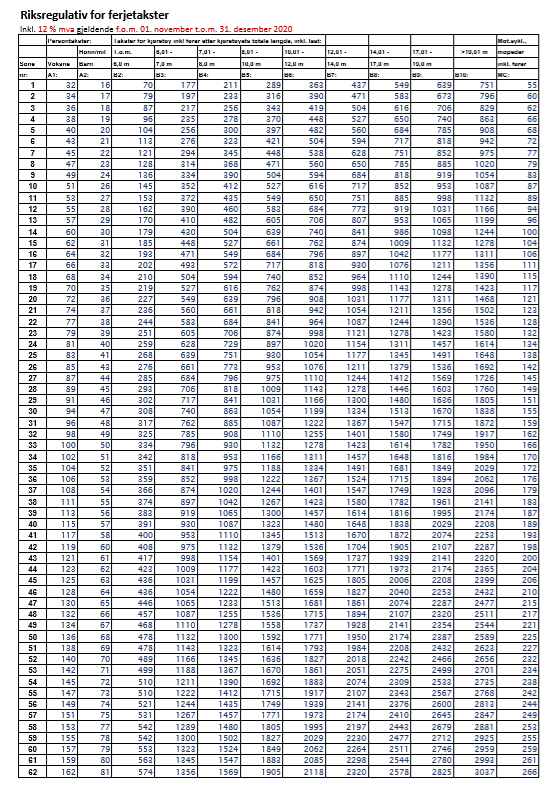 Vedlagt er AutoPASS-regulativ for ferjetakster og Riksregulativ for ferjetakster gjeldende f.o.m. 01.11. t.o.m. 31.12.2020, inkl. tilhørende pristabeller.