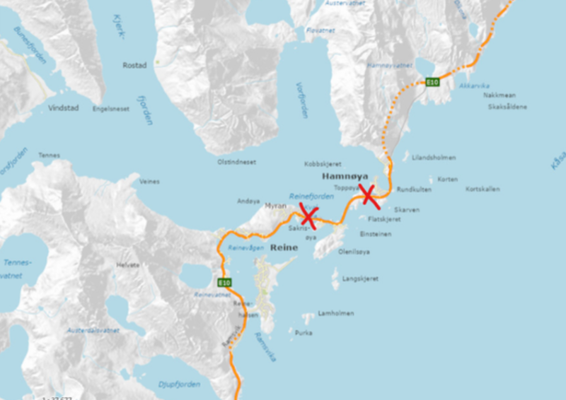 | Storvalen og Breisundet bru på E10 i Moskenes kommune blir stengt klokka 23.00-06.00 i perioden 5. - 9. mars. Kart: Statens vegvesen.